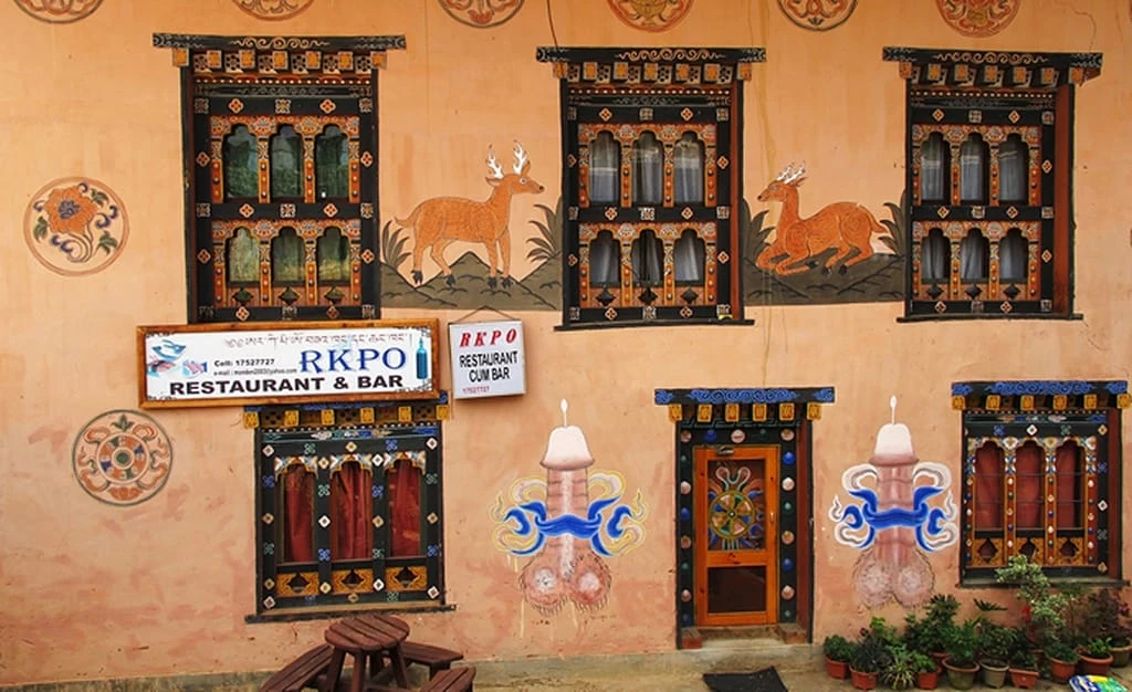 不丹,当她长期与外面世界隔离,保留下来最珍贵的,除了没有任何污染的空气和山林外,应该就是纯朴的生活方式,人性的美好和自由了,不可否认的是,宗教信仰在这中间起了非常重要的作用。在不丹,当我走进乡村里,几乎家家户户外墙上都画有男性生殖器的图案,有的大门正中上方挂着生殖器的木雕,或把生殖器造型雕在房屋顶部的四个角上,更有把生殖器木雕与佛像摆在一起供奉的,传说能给房内的住户带来好运。