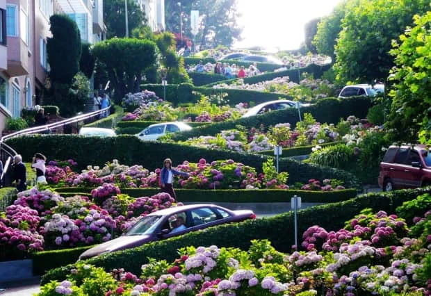 大家知道旧金山很多小山坡,上下道路都是坡度很大,这里本来也是直道,但是过于陡,所以上世纪20年代政府考虑到安全因素,别出心裁的设计了来回八个之字弯,并且规定车辆通过时速不能超过5英里,且从上到下单向行驶。同时为了道路环境以及缓解驾驶者紧张的情绪,两边街道上种满花草,尤其是在花开时节,整条街道花团锦簇,美不胜收。美国人真有创意,竟然把交通难点改造成了旅游景点,而且还是很自然的。因为有连续有八个急转弯,有40度的斜坡,且弯曲像“Z”字形,所以车子只能往下单行。街道上遍植花木,春天的繍球,夏天的玫瑰,秋天的菊花,把街道点缀的花团锦簇。车道两边的花坛里种满了玫瑰,街两边家家户户也都在门口养花种草,花开时节,远远望去,犹如一幅斜挂着的绒绣,美不胜收,“花街”的美名,也因此而来。