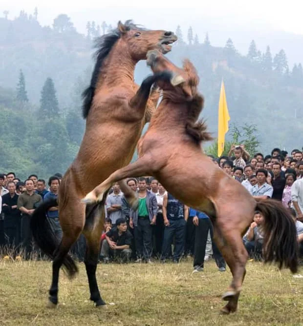 朋友,你一定听说过西班牙的斗牛、新加坡的斗鸡和日本的斗蜘蛛吧?但是你不一定听说过还有我们中国人的斗马吧?这就是广西融县水西北部山区的安太、洞头、四荣、香粉、安陲等乡村苗族同胞的斗马。斗马的习俗被世代延续下来,现已成为苗寨的一道独特的风景线。酷爱斗马的苗民视马为宝贝,简直就是把它们当上宾供起来,除免其劳役之苦外,一有时间还带它到山林里溜达游玩,或者到河滩滚沙、溪边洗澡,悉心照料,一丝不苟。大战来临之前,马会受到更高的待遇,吃的是黄豆和糯米,再加上花生和白糖,比主人的一日三餐还要丰盛许多。及至上场前一刻,马主人还要奉上米酒为其饯行,真可谓关爱有加、无微不至。生活仍较为贫困的苗民竟以如此用度来呵护斗马,足见其对斗马活动的喜爱和重视程度。