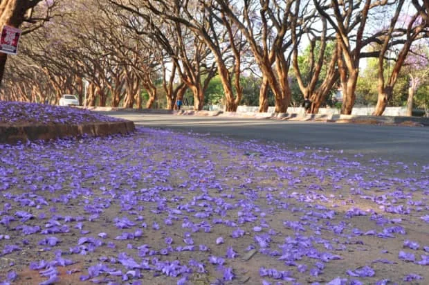 花树已经成为哈拉雷人生活的一个不可或缺的组成部分,即使再穷再苦,只要树在花在,他们就不会太忧郁!蓝花楹原产地:巴西.九月到十月,漫步在津巴布韦首都哈拉雷的街头,你一定会被铺天盖地的紫色花树所震撼。她的花朵柔美雅致,一串串紫色的铃铛从枝头垂落,一花惊艳一世界。她的树干粗壮苍劲,长达几十米的枝干向天空与四方徐徐伸展开来,一树成就一森林。这种花树叫做蓝花楹,原是南美洲的树种,后经殖民者引入南非。1899年,一对津巴布韦的新婚夫妇前去南非德班蜜月旅行,因为错过了火车,决定在德班再停留一个星期。他们在德班的植物园闲逛时,恰好看到了一些蓝花楹的幼苗。似乎是前世的缘分,虽然这些幼苗当时并没有开花,但当这对夫妇听了工作人员的介绍后,对这种来自于遥远的南美洲的花树产生了浓厚的兴趣。他们买下6棵蓝花楹的幼苗,将她们带回哈拉雷,种在Josiah Chinamano大道旁的花园中。二十世纪初,英国人和荷兰人在南非发动的布尔战争刚刚结束,受到布尔战争的影响,哈拉雷的白人也沉浸在一片忧郁的气氛中。为了缓解人们的忧郁情绪,哈拉雷市政厅免费提供蓝花楹的幼苗和铲子,雇佣失业人员,在哈拉雷的街道和公园广泛种植。公园监督人约舒亚·比林斯负责看管这些幼苗。到了二十世纪二十年代,这些幼苗长逐渐长大,许多主要的街道被蓝花楹笼罩。每到春夏之交,哈拉雷就成为了一片紫色的海洋。哈拉雷逐渐以“花城”的名号享誉世界。约舒亚·比林斯认为,正是蓝花楹治愈了人们的忧郁。约舒亚·比林斯在市中心的联合广场种植了几十棵蓝花楹,如今,这里已经成为蓝花楹的公园,每到花开时,人们都爱来此放松休憩。大道两侧的蓝花楹早已成为世界最美的道路之一。在这条双向四车道公路两旁,各种着两排高达几十米的蓝花楹。这些树木将近百岁,高大粗壮的树枝遮天蔽日,形成一道壮观的紫色长廊。