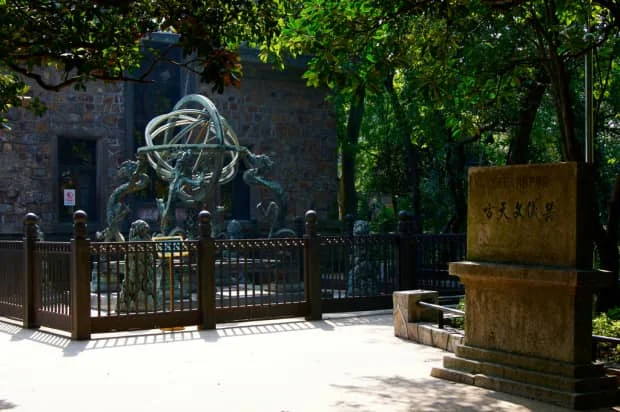 先去参观紫金山天文台旧址。老旧的观测室前,立着石砌中式牌楼,覆蓝色琉璃瓦,当时造天文台为了发扬“中国”的天文,首先在建筑上就规定必须是中国式的,所以除了观测天空的屋子只能是圆顶,景区的中式建筑特色浓郁,建筑古朴,颇具民国遗风。在旧址的观测室里,有一架1934年从德国进口的600mm反光望远镜,非常大,该反光镜焦距3米,加上卡塞格林副镜,焦距可达10米。现已“退役”,仅供游客参观。然后到古代天文仪器展示区,这是天文台最精华的部分。有外形类似于地球仪的天球仪,又叫浑天仪,上面嵌满星辰,原物毁于列强侵华,现在看到的是1903年清政府复制的。有外形像几个行星运动的圆形轨迹互相嵌套的浑仪和简仪,都是明正统年间铸造的。先别说它们测量天体位置的精细功能,光是托着仪器的龙形雕塑和架子上的云纹,都已经刻画细腻、生动到让人叹为观止的地步!在这里,还能见到靠日影测时间的圭表,清政府于20世纪初复制的测坐标的地平经纬仪。古代天文仪器边上有名为“子午仪”的屋子,里面主要是介绍“时间”的变换,里面有铜壶滴漏、水漏、秤漏、现代航海钟等计时装置,一步步介绍着时间测量的精度变化,从年、月、日、分、秒到电子钟再到原子钟,时间的长度从粗到细到精。景区另外还有些图文介绍星座、星云、天文观测,陈列小型望远镜的小展馆。
