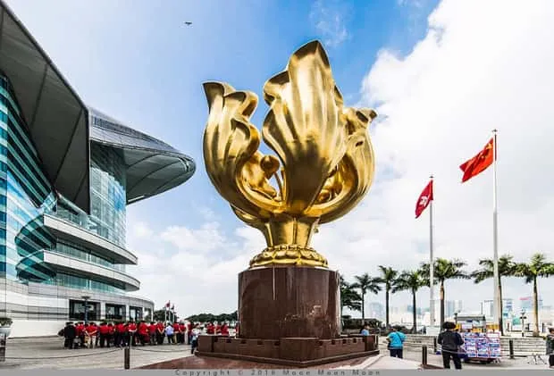 1997年7月1日香港回到了祖国怀抱。全国人大通过的《香港特别行政区基本法》规定,将五星花蕊的紫荆花红旗作为香港回归后的特别行政区区旗。区 徽上一朵洁白醒目的紫荆花在花瓣间缀 着五颗五角星。那鲜红的红旗象征伟大祖国,紫荆花则代表香港,充分体现了香 港是祖国不可分割的一部分。紫荆花花蕊上的五角星象征香港同胞热爱祖国,白花有别于代表祖国其他部分的红色,体现了“一国两制”。