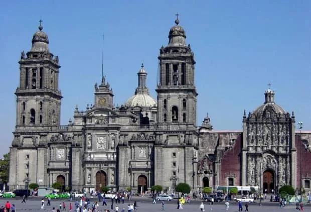 阿兹特克大神庙遗址这片地方曾经是阿兹特克帝国首都的中心,现在常被称为“三文化广场”,三文化广场坐落在墨西哥城东北部特拉特洛尔科区,是一处著名的历史文化胜地。广场上有三组不同时代的建筑物:古代的阿兹特克金字塔大祭坛遗址、16―17世纪西班牙殖民者修建的教堂以及20世纪50年代建造的墨西哥外交部大厦。这三种建筑代表了三种文化,即古代印第安人的阿兹特克文化、西班牙殖民主义者带来的欧洲文化以及墨西哥现代文化。它们奇妙地共存于一个广场上,因此广场得名三文化广场。三文化广场是墨西哥民族和国家历史的浓缩。广场上有一座纪念碑,上面的碑文意味深长:1521年8月13日,夸得莫克曾英勇地保卫过的特拉特洛尔…据了解,大天主堂始建于1573年,历时240年至1813年才竣工。两座钟楼内共有25口钟。16座礼拜堂中有14座对公众开放,有各自华丽的祭坛、绘画和雕塑。大天主堂还拥有2台18世纪巨大的管风琴。漫长的修建时间使这座大天主堂已经不完全是古典的巴洛克风格,应该说更加华美!我登上了大教堂东侧的塔楼鸟瞰广场,画面左侧绵长的建筑就是国家宫。