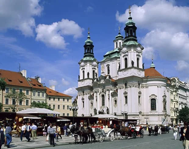 古老的建筑和宏伟的教堂使得老城区广场成为欧洲最美丽的历史景观。广场中最显眼的是蒂恩大教堂。教堂有两个地标性的巴洛克式对称尖塔,在布拉格的任何地方都能够看到它,尤其是夜幕之中被灯光照亮的时候更是格外惹人注目。
