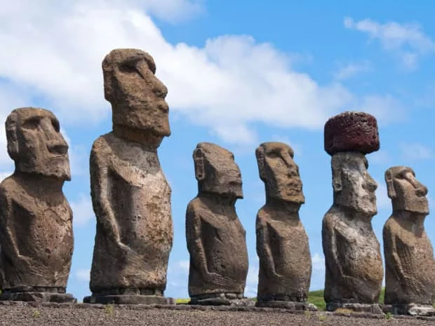 复活节岛上已发现的石像有887尊,这些被当地人称作“摩艾”的石像大多数是在采石场由黝黑的玄武岩、凝灰岩雕凿而成,并由滚木运送到海边已经建好的祭坛上,通过原始的方式竖起来,以此纪念岛上去世的重要领袖,保佑子孙后人。据统计,复活节岛上石像平均高度约4米,平均重量约12.5吨。最大的一座约22米,重160-182吨,但因没有完工最终遗弃在采石场。完工的石像中最大的高9.8米,重约74吨。大约50-75尊石像顶上还加了采自Puna Pau火山的红色火山岩,用来代表发鬃,当地人称之为普卡奥,传说这些红色的发鬃可以为石像带来神秘力量。