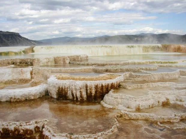 同样位于美国黄石公园猛犸温泉,是世界上已探明的最大的碳酸盐沉积温泉。它最显著的特点当属米涅瓦阶地,那是几千年来冷却沉淀的温泉水所形成的一连串阶地。几百万年前马姆莫斯地区底部的海水,为这里留下了厚质的沉淀性石灰石。当高温的酸性溶液流经岩石层到达温泉表面的过程中,它溶解了大量的沉淀性石灰石。一遇到空气,溶液中的部分二氧化碳就会从溶液中挥发。同时固体矿物质形成并最终以石灰华形式沉淀,就形成了阶地。