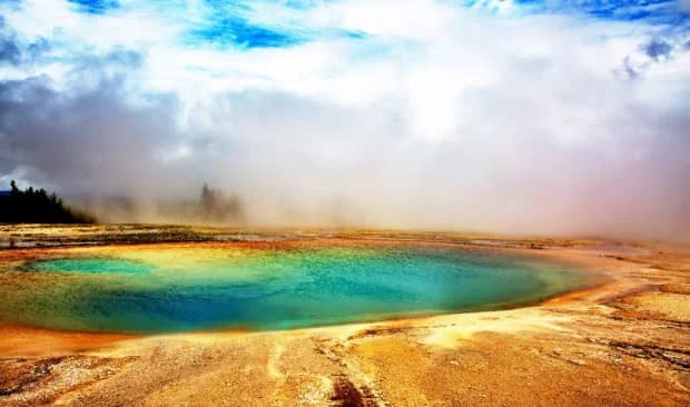 位于黄石国家公园的大棱镜温泉又称大虹彩温泉,是美国最大,世界第三大的温泉。它宽约75至91米,49米深,每分钟大约会涌出2000公升,温度为71°C左右的地下水。大棱镜温泉的美在于湖面的颜色随季节而改变,春季,湖面从绿色变为灿烂的橙红色,这是由于富含矿物质的水体中生活着的藻类和含色素的细菌等微生物,它们体内的叶绿素和类胡萝卜素的比例会随季节变换而改变,于是水体也就呈现出不同的色彩。在夏季,叶绿素含量相对较低,显现橙色、红色,或黄色。但到了冬季,由于缺乏光照,这些微生物就会产生更多的叶绿素来抑制类胡萝卜素的颜色,于是就看到水体呈现深绿色