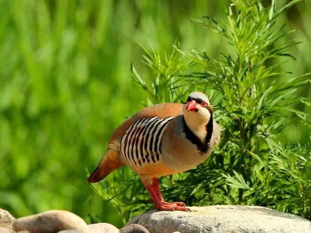 石鸡是中型雉类,两胁具显着的黑色和栗色斑。第1枚初级飞羽介于第5和第6枚飞羽之间,或于第6枚初级飞羽等长;第3枚初级飞羽常是最长的。尾圆;尾长约为翅长的2/3;尾羽14枚。雄者具微小的瘤状距,嘴和足红色。雌雄在羽色上一样,仅在大小上有些不同。嘴、脚珊瑚红色。虹膜栗褐色。眼的上方有一条宽宽的白纹。围绕头侧和黄棕色的喉部有完整的黑色环带。上体紫棕褐色,胸部灰色,腹部棕黄色,两胁各具十余条黑、栗色并列的横斑。栖息于低山丘陵地带的岩石坡和沙石坡上,以及平原、草原、荒漠等地区。