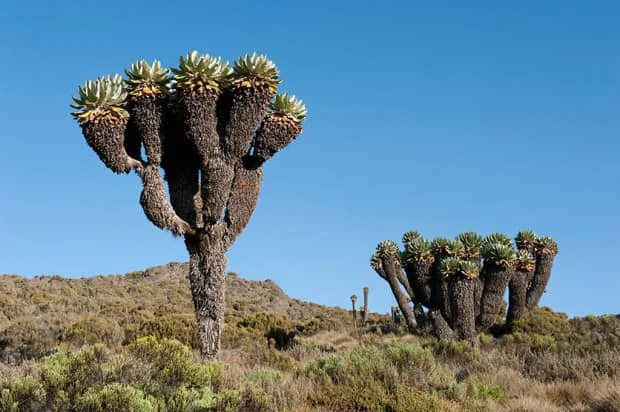 这一天我们花了7个小时长途跋涉去往海拔3700米的营地。森林早转化成草甸,宽边帽和围脖此刻就是我的救星。阳光同样将自然界的美表现无遗,我们不时回头眺望那渐渐落在身后的壮美平原,眺望非洲大地那古老而苍凉的美。这里大约是平原到顶峰的中间,我已经开始感到高度带来的眩晕,可后面还有2000米需要攀爬啊。