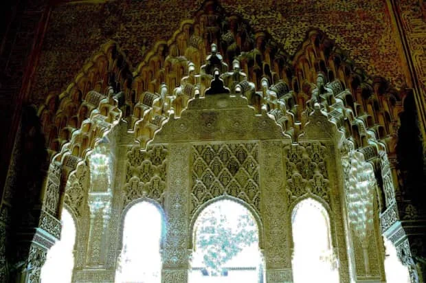 阿尔罕布拉宫美得令人心醉:精雕细刻的镂空木窗把阳光切割成金黄色的碎片,洒在满地的阿拉伯风格马赛克上,色彩迷离如幻;柱头墙角的浮雕花纹一半隐没在浓重的阴影里一半熠熠生辉,光影的旋律每一刻都在变变化,一刻比一刻更强烈。游客们迫不及待地举起相机,因为谁都知道不能错过这美丽的场景,在我眼里,阿尔罕布拉它象征着这所宫殿所经历过的命运:一个日暮途穷的文明,在沉沦之前的最后一刻总是无比辉煌。建造阿尔罕布拉宫的时代,摩尔人在西班牙的经营早已越过了繁荣的颠峰,一天天地衰落,与基督教徒的争夺战屡遭失利,丧失了大部分领土,只剩下格拉那达这一个小小的王国苟延残喘,谁都清楚,穆斯林失去这块最后的容身之地被赶回北非老家,充其量只是一个时间问题。然而,正是在笼罩着愁云惨雾的最后两个世纪里,摩尔人打造出阿尔罕布拉这样一所无与伦比的宫殿,就如同一个身患绝症的病人更懂得珍惜生命,失去了未来的摩尔人对现世的美更加迷恋和执着,为此倾注了他们所有的智慧、技巧和想象力。