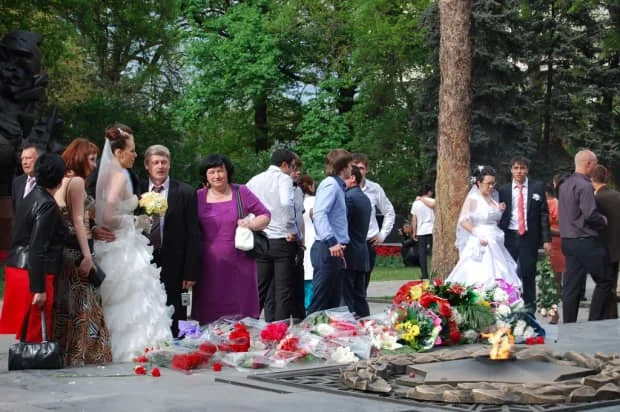 潘菲洛夫公园(又叫二十八烈士公园),这是为了纪念苏联卫国战争中牺牲的潘菲洛夫将军和他的红军战士而建的。这是一个没有围墙的公园,缓步而入,穿过一片树林,迎接我们的是一组气势宏大的雕塑,气势磅礴,势不可挡,足有十几米高,顿时我仿佛置身于硝烟弥漫的战场,在潘菲洛夫的带领下,勇士们正迎着德军的炮火往前冲去。连着这组雕塑的三十米开外是永不熄灭的长明火,目光到处让人感到一种神圣。当我走近这组雕塑时,看见有一对新婚男女在几位亲友的陪同下虔诚地向英雄们献花,男的西装革履,女的则是一袭纯白的婚纱,在两旁青翠的松柏的映衬下显得格外醒目。看来哈萨克斯坦青年男女结婚继承了前苏联的革命传统,他们用这种向烈士献花的方式来表达对英雄的仰慕之情,同时见证爱情的坚贞不渝。我的心中顿生敬意。