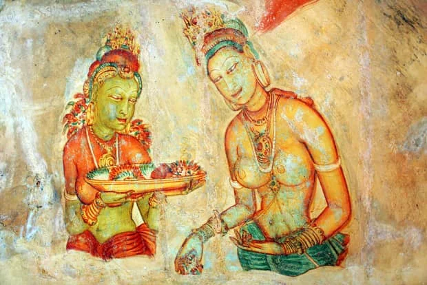 对狮子岩“不高大”的初步印象,到了我开始攀登时开始改变,攀登到半山时彻底改变。顺着利用地形修造的阶梯往上攀爬,在之字形阶梯的右端,有个小平台,远望,一马平川。从小平台左转,连接着一段栈桥,栈桥的终点,是垂直的紧贴悬崖的两个悬转铁梯,透过外层的保护网往外看地面,令人心跳加速。这段胆战心惊的代价还是值得的,铁梯带我们走到绘有彩色壁画的石壁。这些古仕女壁画是卡西雅伯画给被他杀死的父亲,慰其亡灵。这些丰满半裸的仕女图,包括老国王的嫔妃、天女等形象。历经千年,这些壁画仍然鲜艳亮丽,精美无比。这些女人也真不简单,先把人搞得团团转才能见上一面。小小的岩洞里,保存8幅较完好,色彩鲜丽,造型生动的仕女图。她们头戴宝冠,手持鲜花,体态丰盈,臀部以下被迷雾遮盖,细看之下,其中一人多了只手掌,另一人多了个乳头。据说在狮子岩四周的悬崖,原有500多幅彩图,如今仅剩22幅,经岁月侵蚀及人为破坏,一些已无法呈现原貌。绘制壁画时,工匠们先在绝壁里向内凿出一段凹洞,用特殊的材料将凹洞表面敷平后,再用斯里兰卡出产的颜料描绘仕女图。分布在一个小小的岩洞里这22幅壁画均为仕女图,它们保存完好、色彩艳丽、造型生动,色调以红、黄、绿、黑为主色,上身裸露,摆出飞天散花等舞蹈姿势,仪态万千,煞是引人注目。这些壁画不仅是斯里兰卡古代艺术的珍品,也是斯里兰卡历史上唯一流传下来的非宗教题材壁画,与印度尼西亚的婆罗浮屠、柬埔寨吴哥窟和印度阿旃陀石窟齐名。