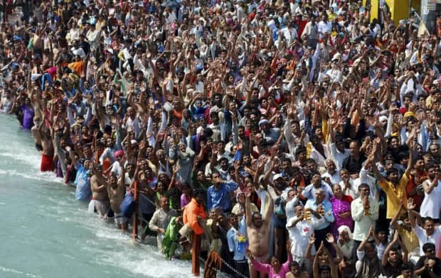 赫尔德瓦尔的恒河是印度最圣洁的水域,节日期间它则成了洗刷灵魂的甘露。冰冷的河水,挡不住他们坚定的意念。双手合十作祈祷状的虔诚信徒,集体涉入水深及膝的恒河中。虽然此时恒河水寒冰彻骨,但为了淘尽罪孽,有些男性全裸入水,更有的女信徒索性剃光了头发。信徒们在恒河中边沐浴边祈祷,相信圣水不但能洗涤肉体的疲惫,洗涤现世的罪孽,还能清除灵魂的污垢,摆脱苦难,从生死轮回中得到永恒的解脱。