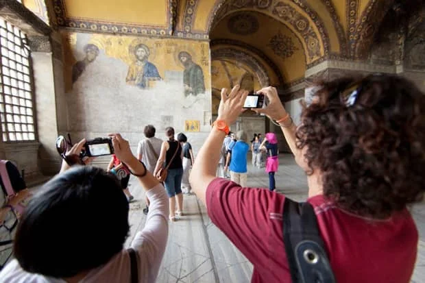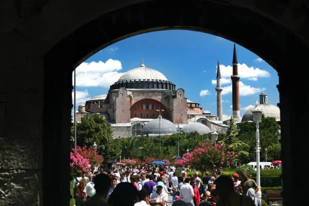 伊斯坦布尔位于东西方的交汇处,在伊斯坦布尔的许多古代奇观中,最著名的是圣索菲亚大教堂,它作为伊斯坦布尔和世界的一个宗教中心长达1400多年。圣索菲亚大教堂是世界上一座伟大的建筑丰碑。它那直径为31米的壮观圆顶世界罕见。被誉为“上帝智慧”的圣索菲亚大教堂的建成和装修只用了短短的6年,即532年至537年之间。圣索菲亚大教堂被称着是伊斯坦布尔的第一景点,在岁月的洗礼和频繁的地震影响下依然气势恢宏,巍峨壮美。笔者最近走近内部细看,但也显得有些斑驳沧桑了……