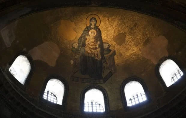 历史的变迁,圣索菲亚大教堂在建成后经历了900多年,于1453年被穆罕默德下令把这座基督教教堂改成伊斯兰教的清真寺,改造者们把许多浓厚伊斯兰传统风格的东西覆盖在原基督教的壁画上面,甚至在教堂外建起了高高的宣礼塔。但是随着岁月的流逝,原来被覆盖了的壁画又逐渐露出原来的面貌,无形之中,两种不同体系和风格的宗教信仰风格在此融为一体,令世界各地不同信仰的人们在此驻足、流连,共同欣赏这旷世之作。